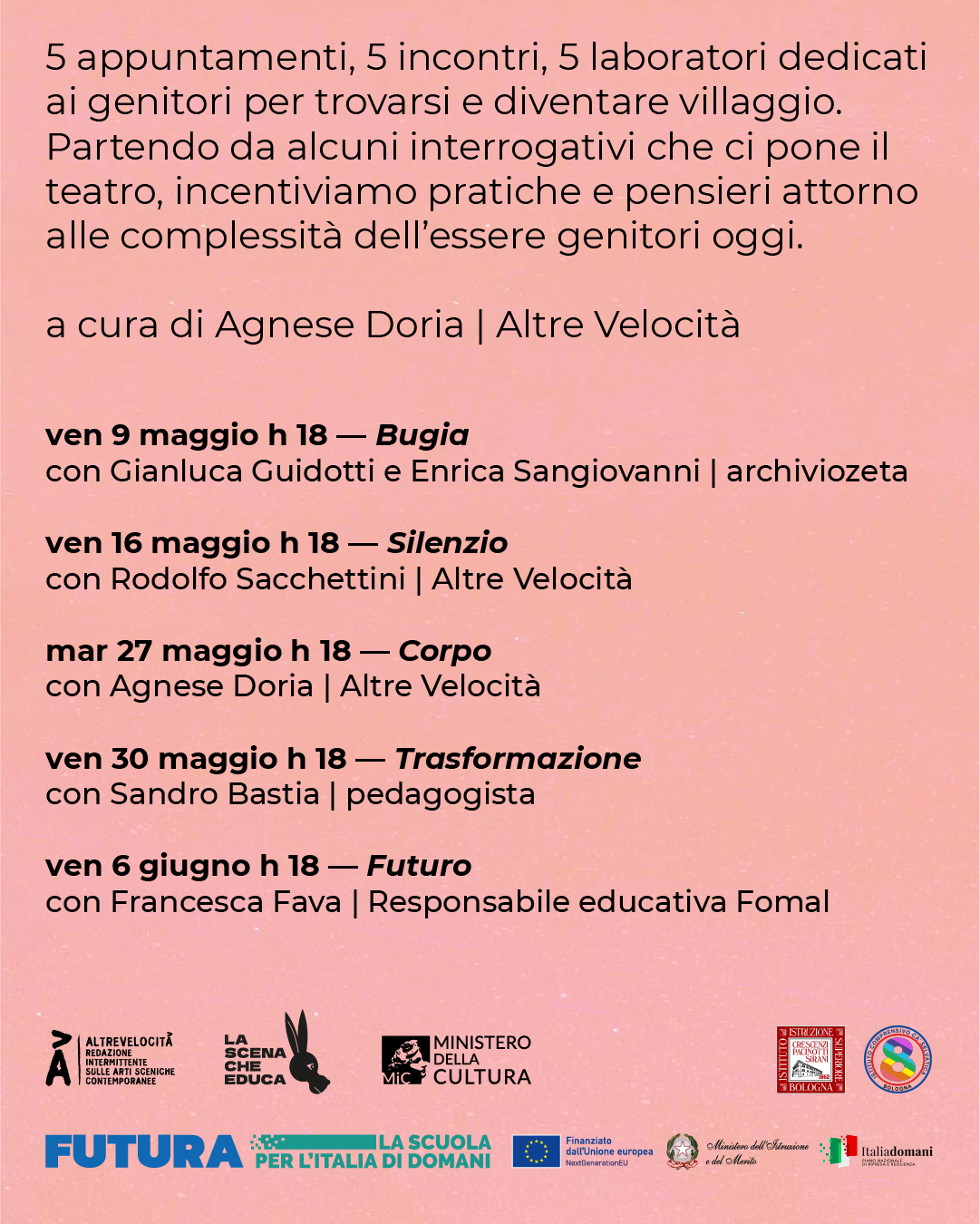 5 appuntamenti, 5 incontri, 5 laboratori dedicati ai genitori per trovarsi e diventare villaggio. Partendo da alcuni interrogativi che ci pone il teatro, incentiviamo pratiche e pensieri attorno alle complessità dell’essere genitori oggi.