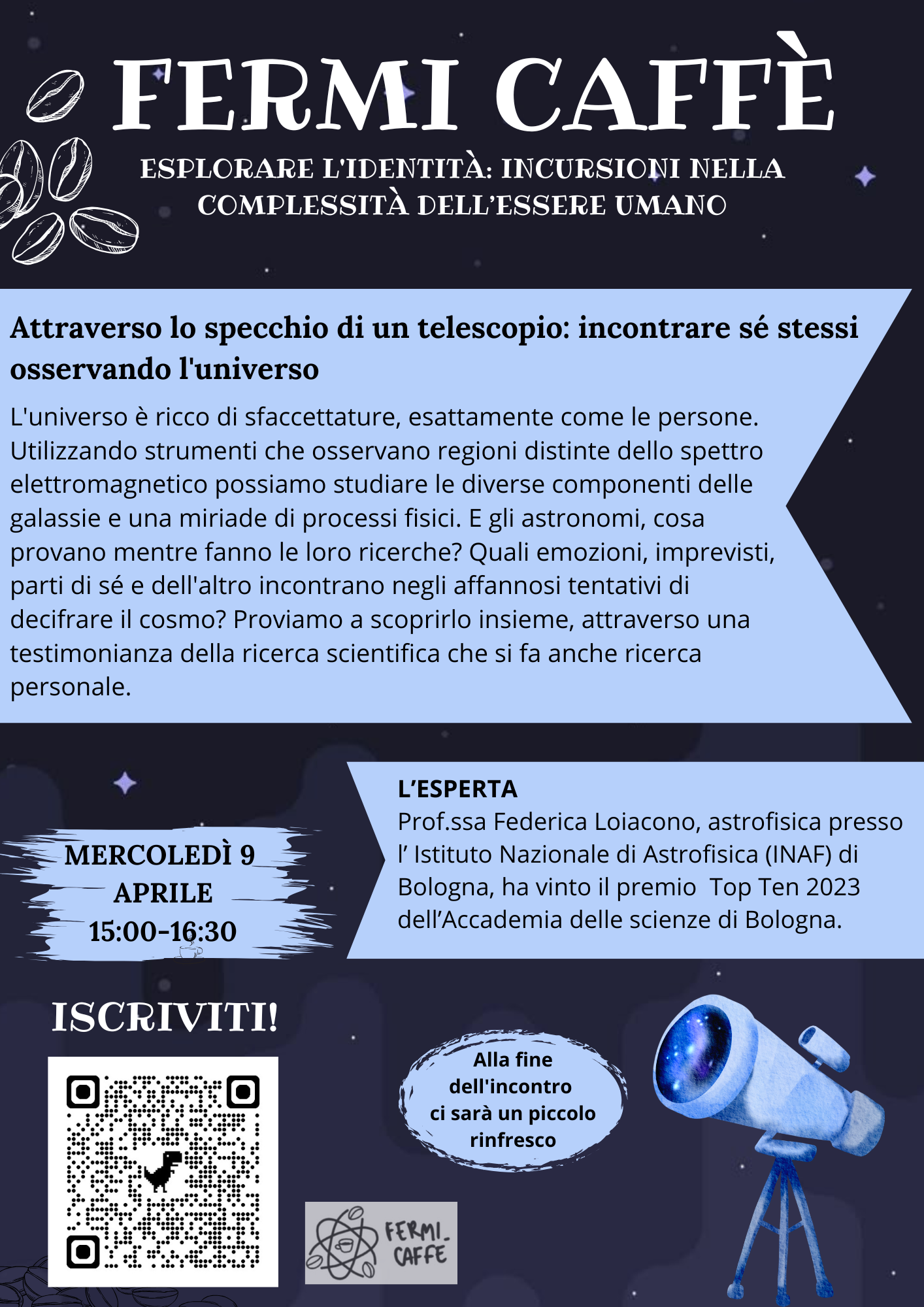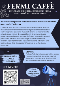 Si comunica che mercoledì 9 aprile, dalle 15:00 alle 17:00, in Aula Magna, si terrà l’incontro del Fermi Caffè dal titolo “Attraverso lo specchio di un telescopio: incontrare sé stessi osservando l’universo”.