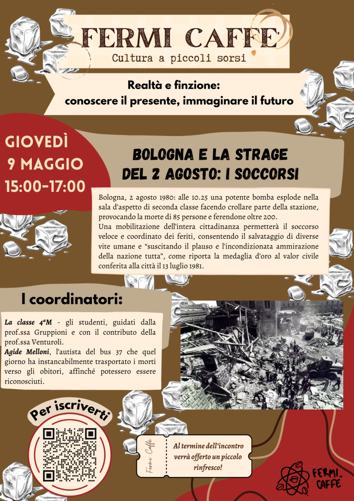 Si comunica che giovedì 09 maggio 2024, dalle 15:00 alle 17:00, nell’Aula Magna del Liceo “E. Fermi”, si terrà un incontro culturale sulla strage alla stazione di Bologna del 2 agosto 1980. L’incontro sarà coordinato dalla Prof.ssa Gruppioni insieme agli alunni della classe 4M e vedrà la partecipazione di Agide Melloni (autista del 37), testimone e membro dell’Associazione tra i familiari delle vittime della strage della stazione di Bologna del 2 agosto 1980. Durante l’evento sarà proiettato un docufilm realizzato dagli alunni della 4M.